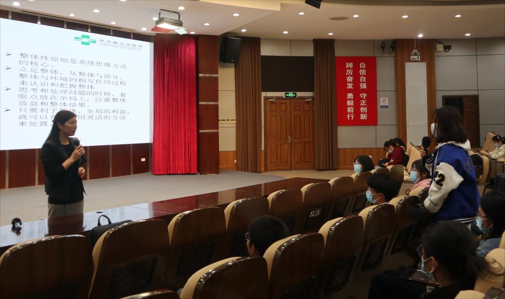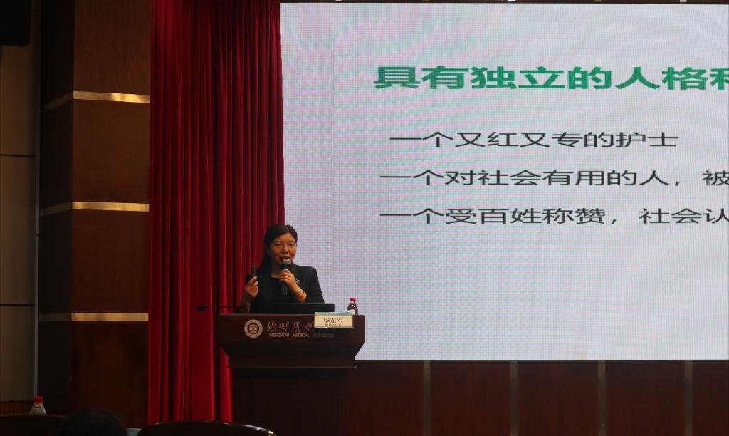 讲坛伊始,毕东军副院长为同学们介绍了台州恩泽医疗中心(集团)的组成与设置、使命与愿景,阐述了医疗中心始终秉持着的“十大信条”与精神文化。她围绕“何为有思想”“如何成为一个有思想的护理人”两大方面,展开了精彩的讲述。