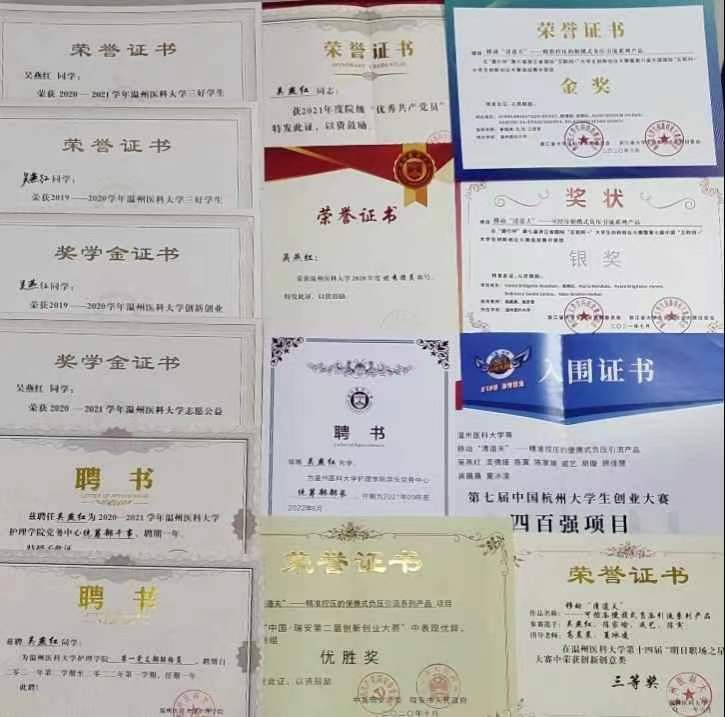 她,勇于探索,无畏艰难,自强不息,砥砺前行。就读本科期间,她荣膺校级三好学生2次、校级团员2次、校级优秀学生干部、taptap点点官方网站自强之星、院级优秀党员等称号;获得创新创业奖学金、社会志愿奖学金;在科研方面,获得一项实用新型专利(第3发明人),在国内一级期刊《军事护理》上发表一篇论文(第1作者);获得第七届中国国际“互联网+”大学生创新创业大赛国赛铜奖(第1负责人)、第六届浙江省“互联网+”大学生创新创业大赛省赛金奖(第2负责人)、第七届浙江省“互联网+”大学生创新创业大赛省赛银奖(第1负责人)、国际护理竞赛学生组二等奖(第2负责人)、杭州市大学生创新创业大赛全国400强(第1负责人)、瑞安市创新创业大赛优胜奖及十余项校赛与院赛奖项。