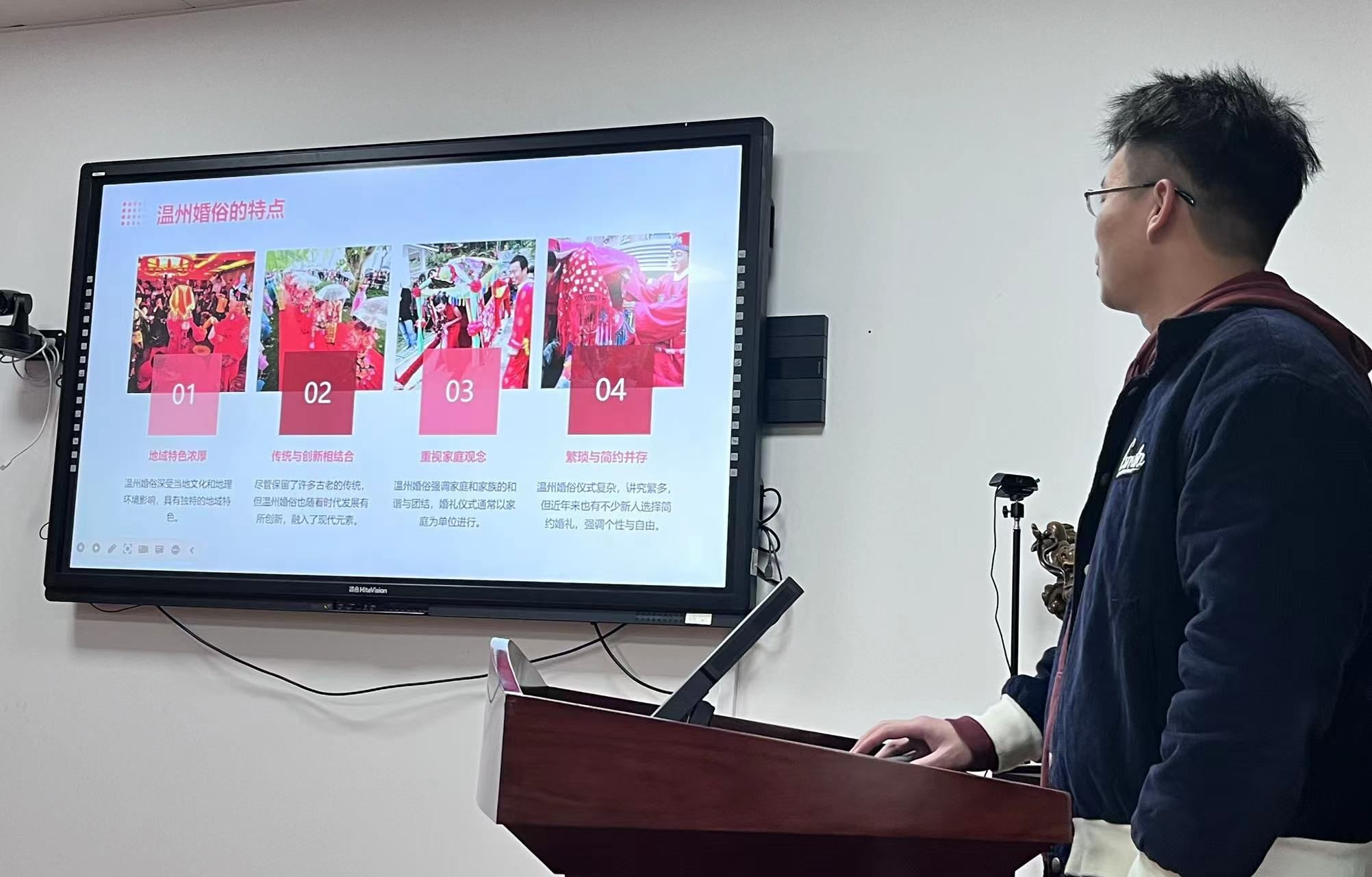 孙博伦老师以《温州现代婚俗》为题,主要从温州婚俗的概述、现代变迁、文化内涵与社会价值几个方面进行分享,地域文化、传统习俗、家庭观念深刻影响着人们的婚姻观念和婚礼仪式,引发了大家关于传承与发展、社会认同和道德伦理方面的思考。