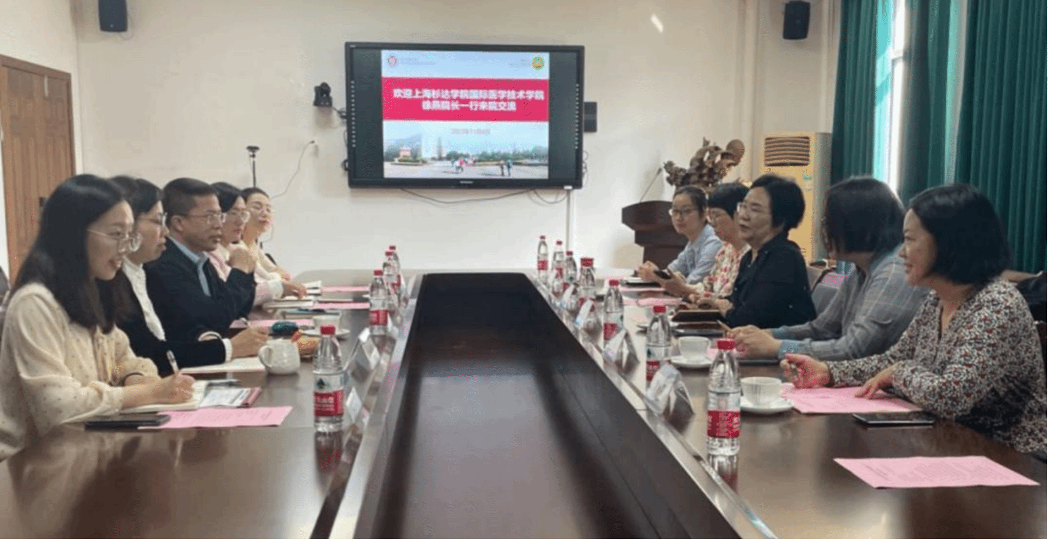 11月6日,上海杉达学院国际医学技术学院院长徐燕、党总支书记丁俭、 副院长张静、护理系主任岳立萍、护理系副主任胡菁来院访问交流。taptap点点院长蔡福满、党委副书记陈素云、教学办主任孙海琴、外科教研室副主任江思思等在学院会议室热情接待了客人。