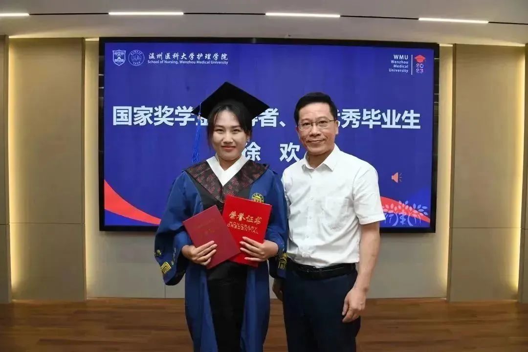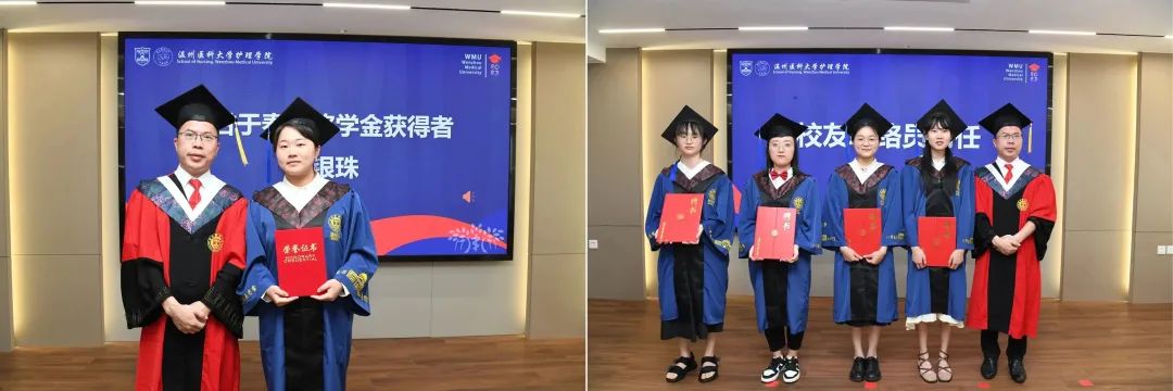 李旭东书记为国家奖学金及浙江省优秀毕业生获得者徐欢同学颁发荣誉证书。蔡福满院长为校友联络员许文仙、蒋雨琪、叶慧雯、张虹和甘于奉献奖学金获得者潘银珠同学颁发荣誉证书。