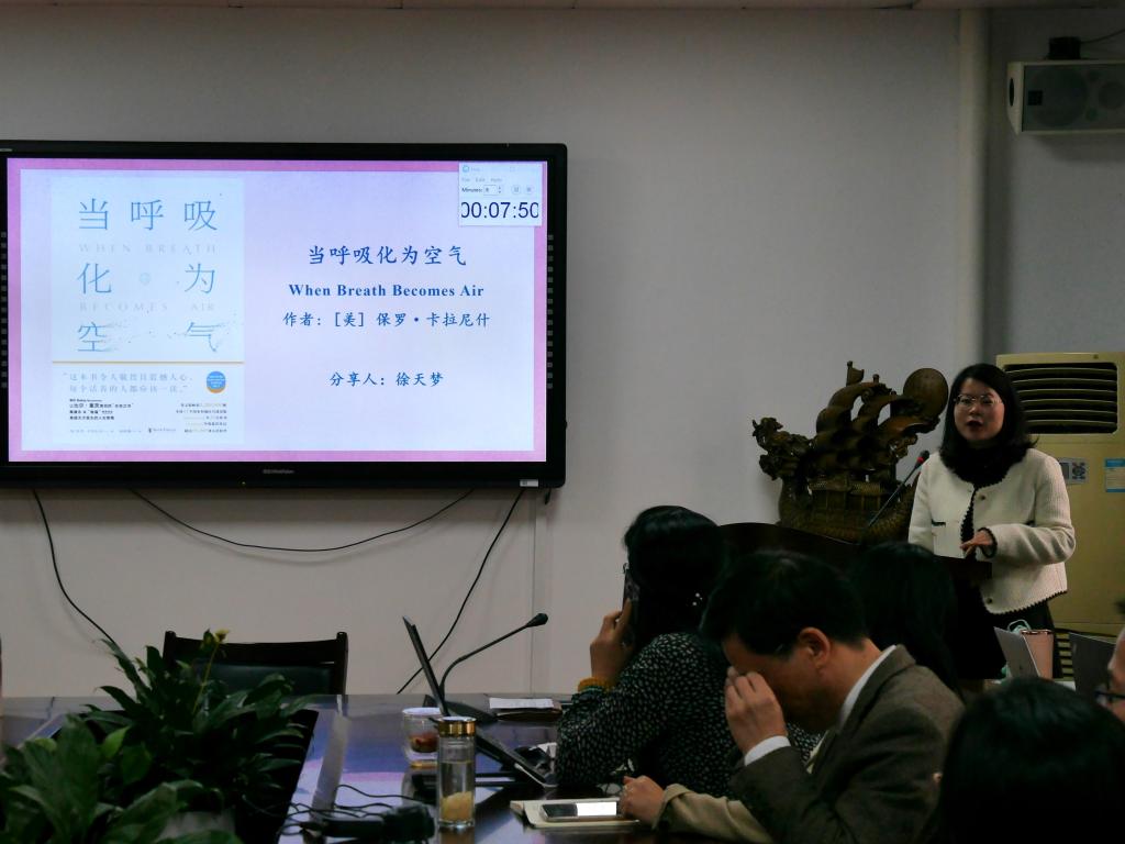 徐天梦老师分享了《当呼吸化为空气》一书。一个风华正茂的医生,变成了走向生命尽头的患者。角色互换,作者保罗·卡拉尼什在生死之交的时候,从死亡中领悟到了生命的意义,给出了他自己的答案:我无法前行,但我仍将继续前行。同时患者的身份也让他明白,病人们去医院所寻求的不仅是科学的医疗救助,还需要医生温情的关怀。