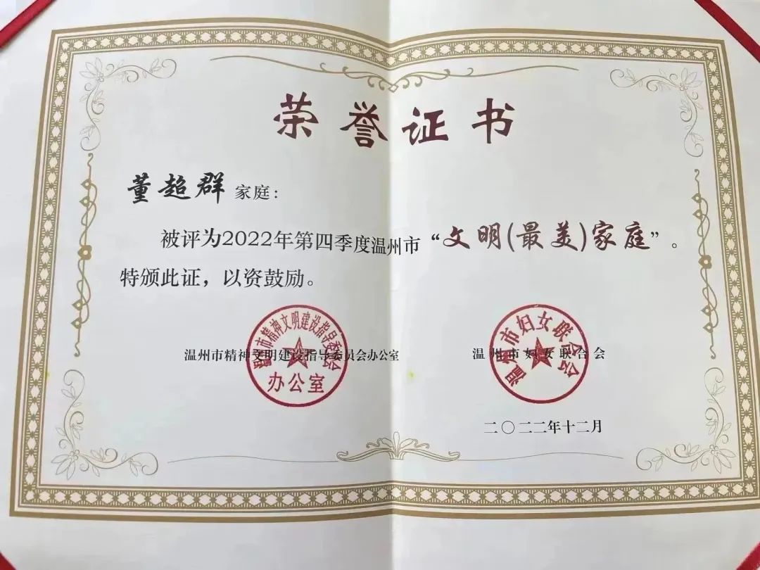 喜报!董超群老师家庭获2022年温州市第四季度“文明(最美)家庭”