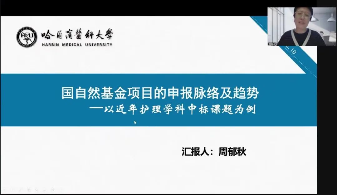 随后,周郁秋教授对国家自然基金项目的申报脉络及趋势进行了专题讲座,以近几年中标课题为例,从护理学科国自然现况、基础研究对护理学科的影响等多个角度进行了解析,总结护理学科国自然研究的趋势及建议。讲座给与会师生带来了很多有益的启发和指导,大家受益匪浅。