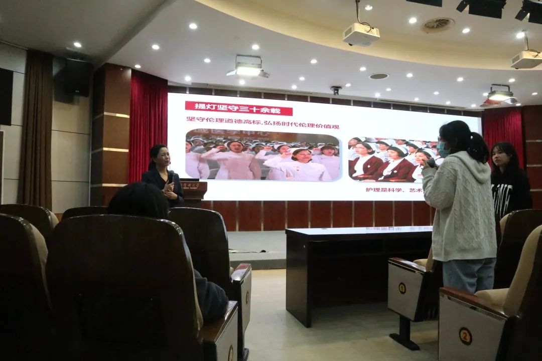在师生互动环节,同学们踊跃提问,就护理临床工作和个人学业追求的平衡,坚守护理事业的初心和动机等问题展开交流。孙彩霞主任对同学的问题表示肯定,并结合自身经历和同学们的具体情况,一一作了解答。最后,她勉励同学们,要把握当下,牢抓核心,提升人文素养和专业知识,实现个人跃升、为学院的发展、中国护理事业的进步,贡献出属于自己的一份力量。