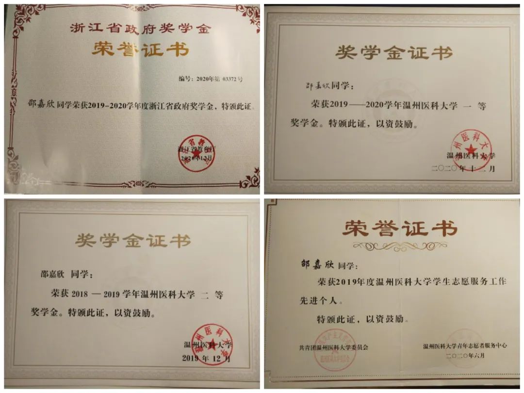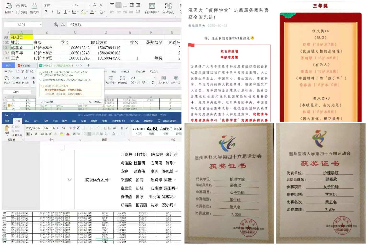 曾累积获得省政府奖学金、校一等、校二等奖学金、院级优秀团员、2019年度taptap点点官方网站学生志愿服务工作先进个人、原创诗歌获taptap点点体育疫路“护”行·征文类三等奖及学院“搏时”云文创活动(急救知识科普)视频类一等奖等多项荣誉。