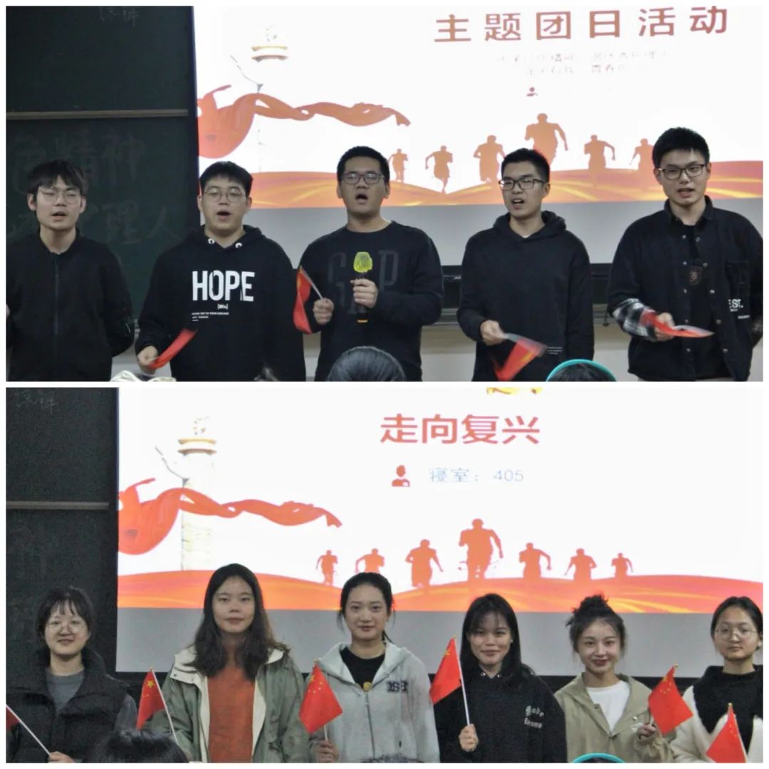 1#101、102和14#405寝室带来的歌曲串烧《没有共产党就没有新中国》、《红星闪闪》、《走向复兴》将主题团日活动的气氛推向了高潮,同学们坚定有力的歌声表达了对党和国家的热爱,展现了新时代中国青年的斗志昂扬、青春力量。