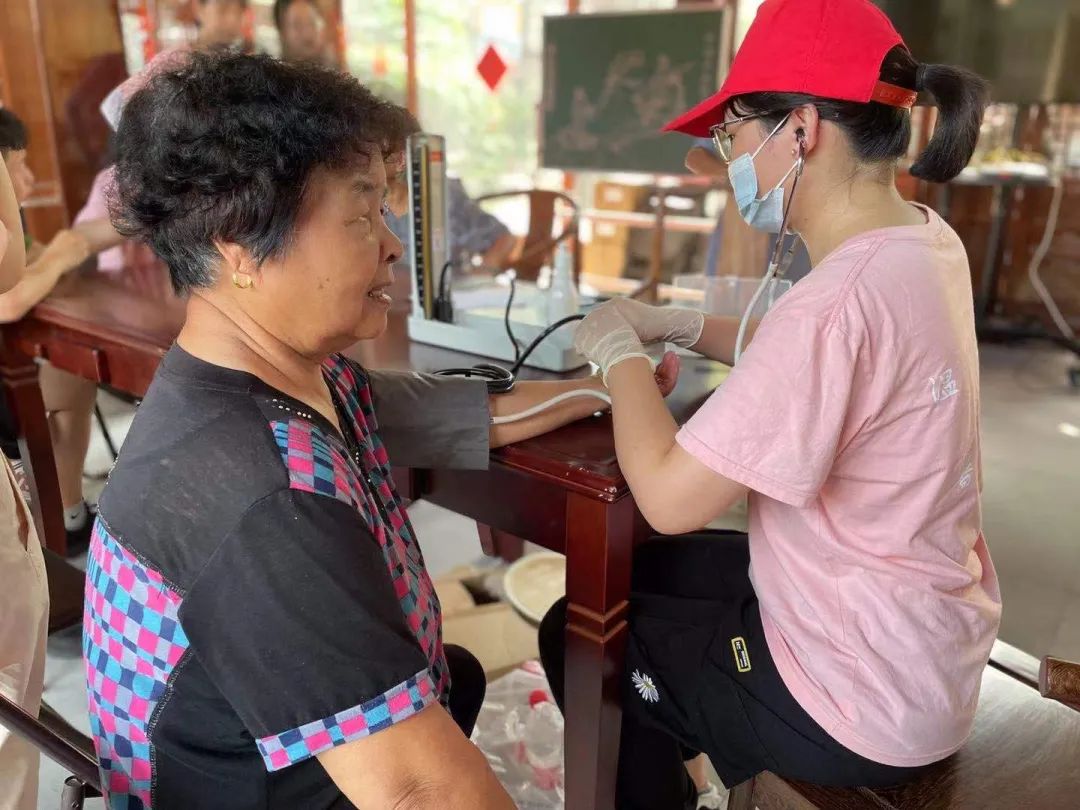 实践队队员通过分发“宣传扇”等宣传方式,引导当地老人于山川书院接受义诊服务。村民们亲切的话语、淳朴的笑容不断拉近与实践队员的距离。宣传中,实践队队员立足专业实际,为老人们进行健康常识科普,提出“合理膳食”“定时监测”“健康锻炼”等意见。