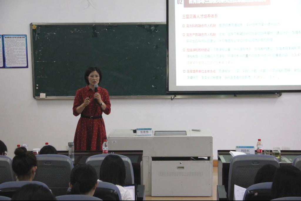 张春梅就“聚焦人才培养,着力提升研究生培养质量”作主题演讲。她从当前研究生培养的形式与任务、现状与问题以及重点工作谋划三方面作具体介绍。她指出,当前研究生教育工作处于深化改革的重要时期,根据教育部指导意见以及学科建设新要求,改革要抓住工作主线,切实落实好六大关键举措。她根据当前研究生教育存在的问题和大家探讨可行性举措,并为未来研究生教育工作制定了详尽的行动方案。