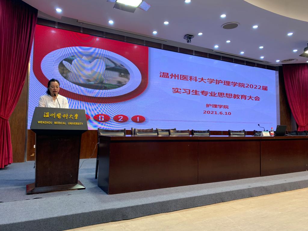 2021年6月10日,taptap点点体育在旭光厅为即将开展实习工作的2022届学生举行实习前的专业思想教育大会,参加会议的有附属第二医院的护理部副主任刘一苇,附属第一医院新生儿科护士长陆宁洁,教学办、学工办相关老师等,800多名学生通过线上和线下方式参加会议。会议由教学办主任孙海琴主持。
