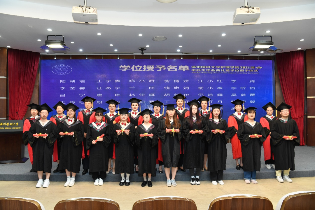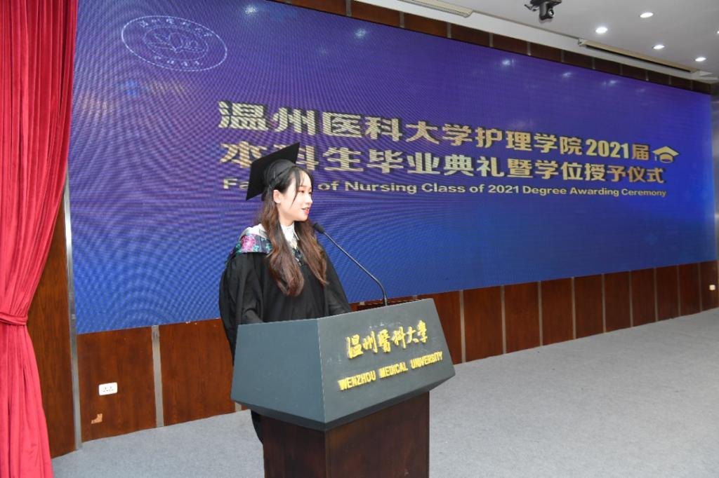 毕业生们穿上整齐的学士服,走上庄严的讲台。导师们为其拨穗,授予学位并颁发校友荣誉证书,肯定他们四年里的成长和努力。因为疫情,护理学(中外合作办学)专业的毕业生,收到远在他方的美方校长和中方校长发来的视频和书信,祝福同学们毕业快乐,前程似锦。毕业生代表林玲珑代表全体毕业生,表达了对母校的不舍和对老师的诚挚感谢,表示要担负起救死扶伤的使命与担当,将所学知识和技能服务社会、报效祖国。仪式现场还有家长远道而来,见证孩子们成长的时刻。“女儿是我的骄傲,非常感谢学校、学院培养了我的女儿。”毕业生陈韩的父亲激动地说。毕业礼成,2021届毕业生即将带着学院的祝福和嘱托扬帆起航!