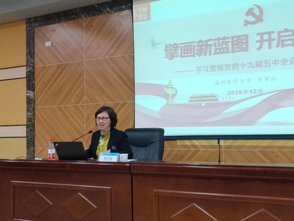 宣讲中,李军红老师紧扣习近平总书记在党的十九届五中全会上的重要讲话精神,从“全会概况”“三个新逻辑主线”“锚定教育强国目标,奋勇担当开创教育高质量发展新局面”和“以人民健康为中心,奋勇担当推进健康中国建设”等四个方面,深刻阐述了十九届五中全会的精神内涵和历史性意义,系统解读了新发展阶段、新发展理念、新发展格局等内容。