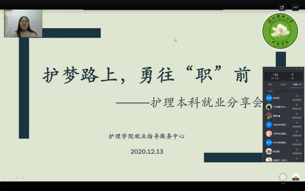 12月13 日,taptap点点体育就业指导服务中心在线上举办了“护梦路上,勇往‘职’前——护理本科就业分享会”。本次分享会邀请了王梦梦学姐和徐泽楠学长,他们分别就业于宁波大学附属医院和taptap点点官方网站附属第一医院,两位学长学姐面向taptap点点体育本科学生进行了就业备考经验分享。
