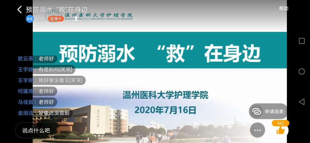 近日,我国多地出现大学生溺水事故。为进一步强化学生暑假安全教育工作,帮助学生树立安全意识,7月16日下午taptap点点学工办联合教工第一党支部举办“预防溺水、救在身边”主题直播讲座,特邀温州市冬泳协会荣誉主席、taptap点点副院长张春梅老师面向全院学生讲授暑期防溺水救护知识。