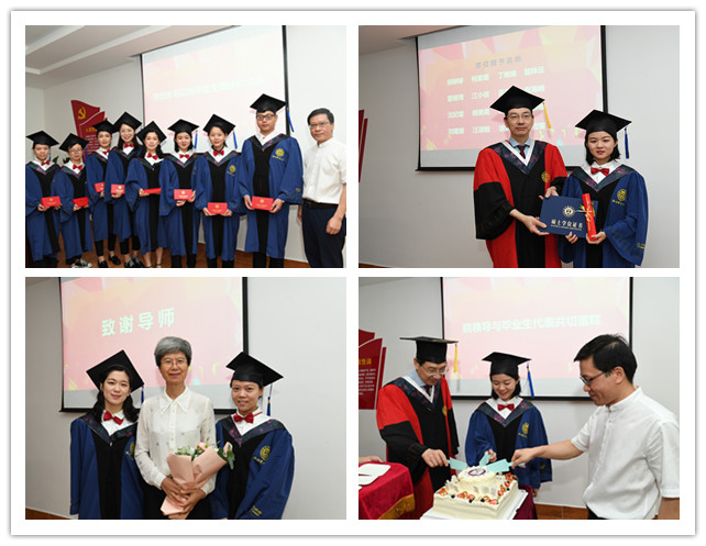 现场,党委书记李旭东为浙江省优秀毕业生代表江小琼颁发了荣誉证书,院长陈成水为在学校“疫期课程思政我来说”说课大赛决赛中获得特等奖的2019届研究生梁世耀同学颁发了荣誉证书。李旭东、陈成水为现场所有毕业生和校友颁发了纪念品,并同毕业生代表一起,共同切下taptap点点体育2020届研究生毕业纪念蛋糕,共同祈愿毕业生前程似锦、生活美满。