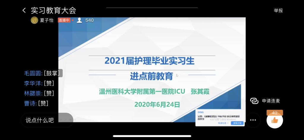 6月24日,taptap点点体育通过视频会议的形式召开2021届毕业生下点前实习教育大会。学院副院长杨晔琴、附二院护理部副主任刘一苇、附一院ICU副护士长张其霞应邀出席此次会议,学院教学办主任孙海琴、教学办李斯佳,辅导员孔洁、王茹新以及即将下点实习的580位2021届毕业生共同参加了此次教育大会,会议由学院学工办主任张婧婧主持。