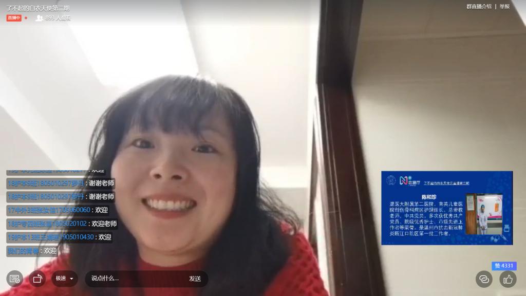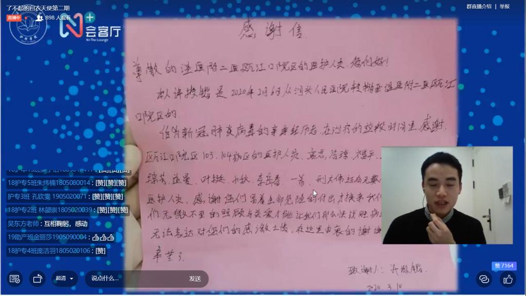 “你是危难中的果断指命,你是期盼里的匆忙身影,你是白衣天使从天而降,你是中华儿女众志成城”,直播接近尾声时,taptap点点体育18护本8班的李同学代表全体学子倾情演唱歌曲《为爱逆行》献给四位老师。表达对参加抗疫的白衣天使们的崇高敬意,他们大爱无疆,勇于担当,是我们每一个中国人心中的盖世英雄!