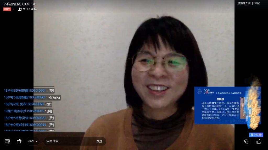护理学子在直播间表达感悟,17护本1班黄同学说“我被她们的无私奉献精神所打动。正是因为一批批像他们一样的白衣天使用娴熟的技术、大爱的情怀以及勇敢的心灵,一位位患者才得以康复出院。前辈们总是把我们保护的很好,但作为护生,我们也必须要准备好接过这个责任。”