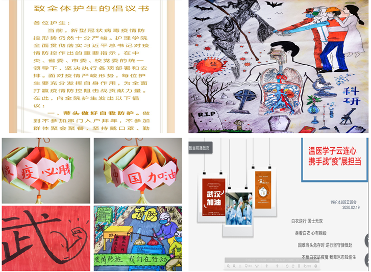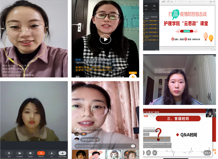 “每位护生要充分发挥自身作用,为全面打赢疫情防控阻击战贡献力量。”辅导员们在“云思政”课堂上再一次宣读了前期发起的《致全体护生的倡议书》,引导护生们做好“五带头”,即:带头做好自我防护、带头提高科学认知、带头遵守学校安排、带头配合防控工作、带头增强必胜信念,充分发挥专业优势,为打赢疫情防控阻击战贡献自己的力量。在“云思政”课堂上,辅导员陈琦结合自己近期在温州市卫健委志愿服务的经历分享当前温州的疫情实况,并结合自己的心理专业知识与学生分享疫情期间保持心理健康和进行心理疏导的正确方式;辅导员李萌向学生宣讲最美逆行者们的英雄事迹以及全国人民众志成城、共克时艰的做法,并为学生推荐一系列文学经典、哲学经典、心理学以及个人成长类的书籍,激励同学们做好规划,利用这个史上最长寒假给自己“充满电”。辅导员们向各班级传达了“温医学子云连心 携手战‘疫’展担当”云班会、“战‘疫’有我,青春同行”特别主题团日活动的通知,组织各班级开展“面对疫情,我们怎么做”大讨论以及一句话为武汉、为中国加油等活动;辅导员们还特别向同学们介绍了前期学院教学办与学工办联合推出的“疫路‘护’行”栏目,鼓励同学们多思考、多参与、多投稿,引导学生秉持“仁肃勤朴、求是奋发”的校训和 “勤勉、仁爱、慎独、求真”的院训,提高思想认知,彰显青年担当,做“担使命、保安康的守护者,宅其身、抱道行的修行者,游必有方的识途者、‘四个自信’的坚定者”。
