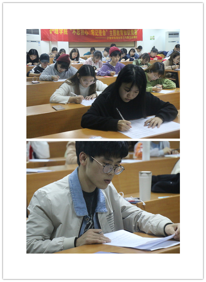 本次报名参赛者达70余位。比赛现场气氛紧张热烈,参赛选手精神饱满、思路清晰、认真作答,充分展现了taptap点点体育学子的良好精神风貌。还未拿到试卷时,同学们的表现千差万别。有的三俩攀谈,神采飞扬;有的独坐一处,自信满满。接下来进入正式比赛考试环节,一张两面的考卷,一人一隔的座位格局,三人来回巡考监考模式,一下子比赛气氛竟紧张了许多。抬头前方是屏幕上醒目的“不忘初心,牢记使命”八字箴言,后面是表情严肃的工作人员。经过近40分钟的比赛考试角逐,比赛圆满落下帷幕。赛后,工作人员加班加点批改试卷,经过裁判认真评分,最终三位同学获得一等奖、五位同学获得二等奖、12位同学获得三等奖。