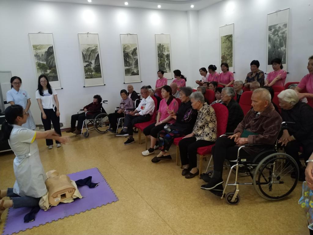 现场,他们为数十位护理员和老人讲解了心肺复苏、气道异物梗阻等急救知识并进行了示范演练。为方便老人理解,他们采用温州话、普通话双语讲解。他们还邀请护理员现场互动,规范他们的急救技能。通过近一小时的培训,护理员和老人们对基本急救技能有了一定的掌握。