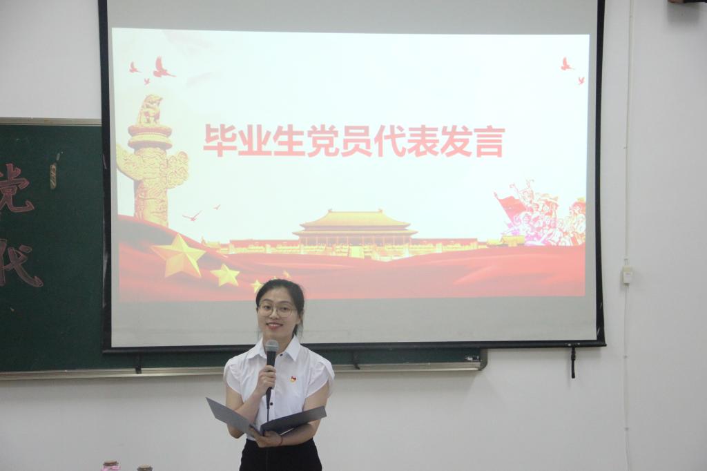 接着,毕业生党员代表殷原芳上台发言,表达了对学院领导和老师们的感谢和敬意,并结合自己的成长经历,勉励低年级党员们乘着时代的春风,放飞青春的梦想,以社会主义建设为使命和担当,为中华民族的伟大复兴努力奋斗。