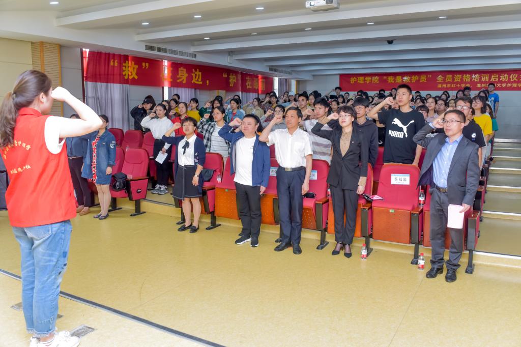 “我宣誓:我是红十字人,热爱红十字事业……牢记使命,恪尽职守,关爱生命,保护健康,维护尊严,为促进和平进步事业而不懈奋斗!” 5月11日上午,茶山校区求知楼报告厅内响起庄严的宣誓声,66名2018级护理学子利用周末时间,参加由taptap点点体育与温州市红十字会合作的“我是救护员”全员资格培训,努力在人生的第一个护士节当天成为一名合格的“红十字救护员”。