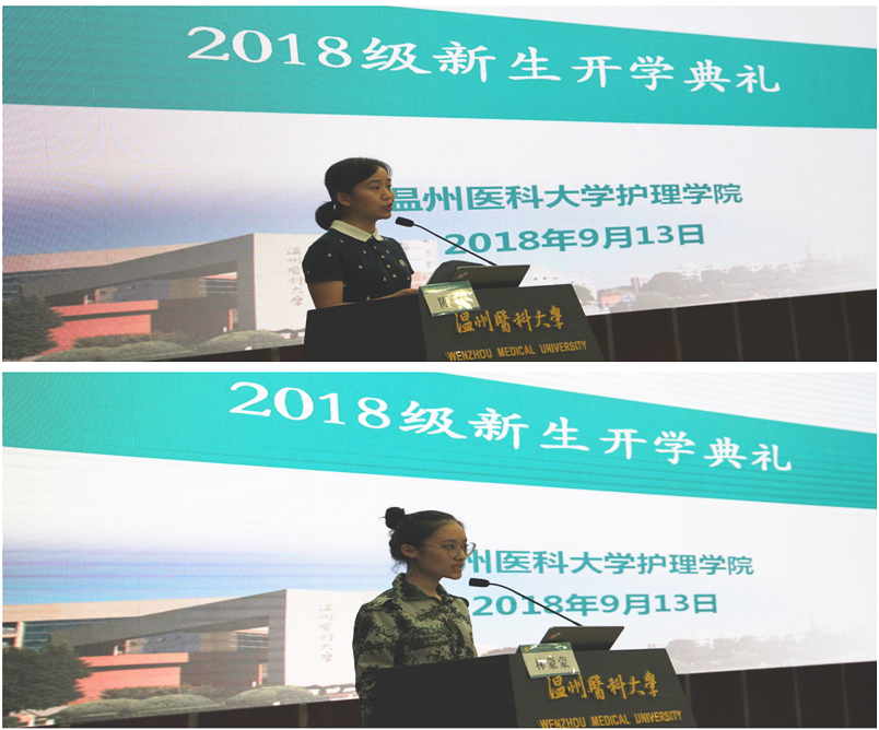 教师代表陈军老师与同学们分享了四个词语:独立、责任、磨砺和尊重,这四个词寄托了全体老师对于学生的寄予的殷切希望和无限温情。新生代表林蒙蒙在发言中表达了对于未来大学生活的满满期望和对护理职业的深深热爱。