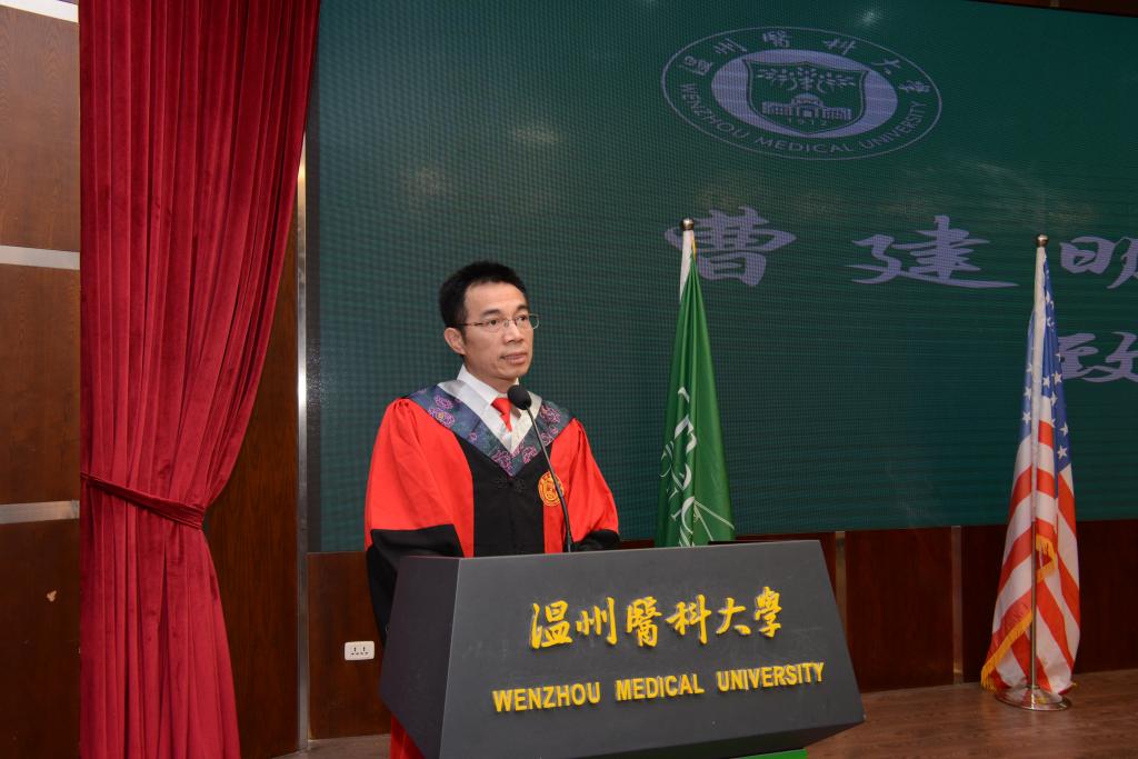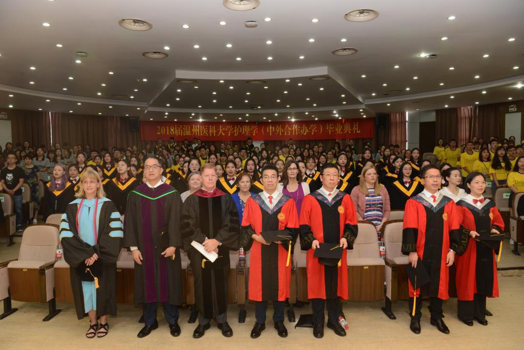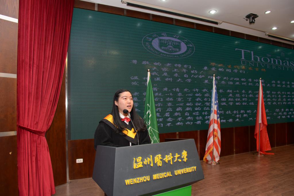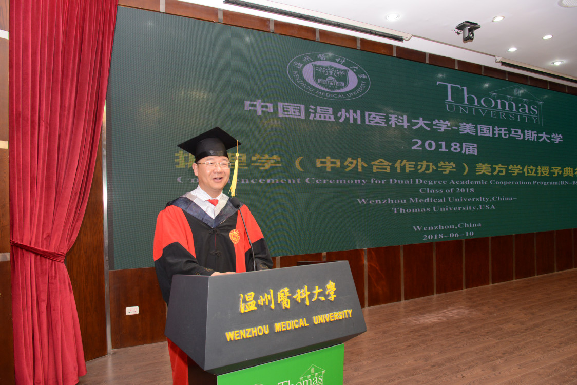 典礼上,曹建明副校长表达了对美方领导和教授们的感谢,对毕业生的肯定和祝贺,并鼓励毕业生们积极展现当代青年的责任和担当。约翰.梅斯副校长现场宣读了该校谢普德校长为托马斯中国合作办学项目(2014-2018)级毕业生写的典礼演讲词,指出“在辩证中,我们会经历许多挣扎和矛盾,但如果你善用这种辩证,你将会获得更多的成功。这意味着你可以成为克服世界上许多造成困扰缺陷的正面力量。”其后,黄磊康博士代替美国托马斯大学中国总校区黄天中校长发表贺词,鼓励护理学子培养学习爱好,发展终生学习,提升自我能力,勇于面对困难,对追求的事物永保活力。毕业生代表李冰蕾在发言中,表达了对四年来一直陪伴的老师同学的感谢,并对创新思维在护理工作中的应用进行了探讨。