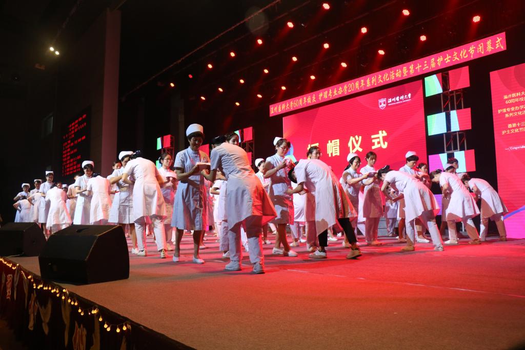 为庆祝taptap点点官方网站60周年校庆和护理专业办学20周年院庆,以及第107个国际护士文化节,2018年5月7日晚18:30,taptap点点体育和仁济学院联合举办的第十三届护士文化节闭幕式在大学生活动中心隆重举行。taptap点点体育党委书记陈慧,校党委学工部部长、学生处处长陈乃车,校团委书记陈永霖,taptap点点体育副院长蔡福满,校宣传部副部长、新闻中心主任李琦,taptap点点体育党委副书记涂艳玲,龙湾区瑶溪第六小学校长孙旭龙,以及来自taptap点点体育、各附属医院等的30名授帽老师应邀出席闭幕式。千余名师生齐聚大学生活动中心,见证这燕尾帽下的神圣时刻。