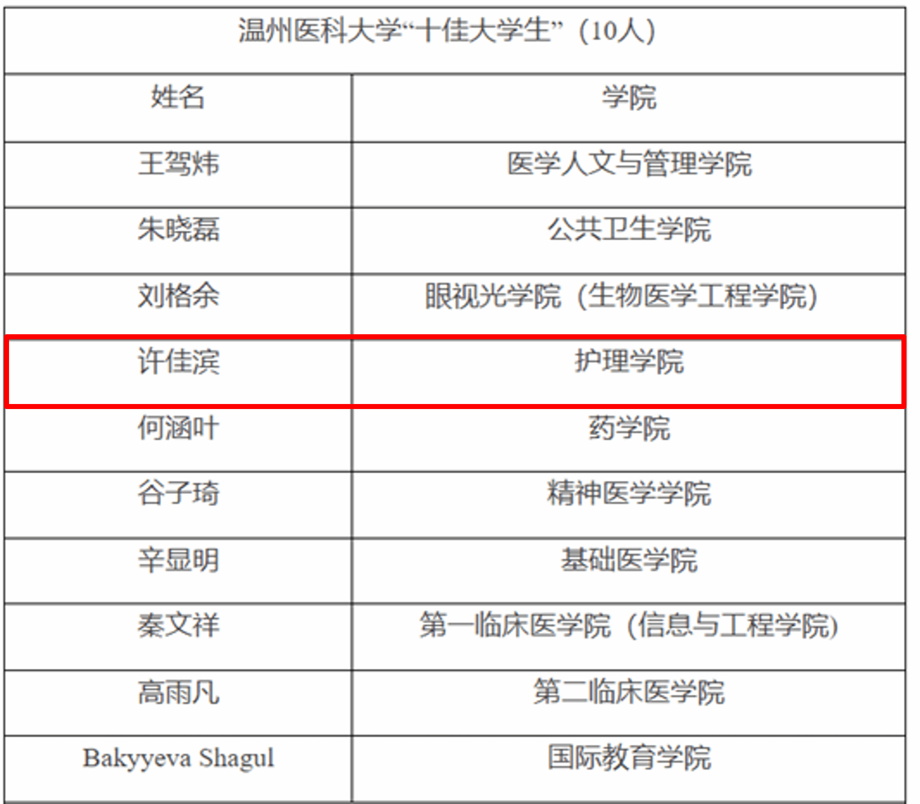许佳滨,2021级护理学2班学生,曾获国家奖学金、国家级大学生社会实践成果“千校千项”网络展示活动优秀视频奖、浙江省优秀毕业生、浙江省第十八届“挑战杯”银奖等2项国家级、8项省市级及28项校级荣誉。以第一负责人主持4项国家级、省级、校级课题,参与3项省级、校级课题,以第一作者发表北大核心论文1篇,参与发表SCI及中文论文3篇。作为急救维他命、康陪宁团队负责人,率队获浙江省暑期社会实践优秀调研报告二等奖、浙江省第十九届大学生电子商务二等奖、温州市暑期社会实践优秀示范团队等荣誉。多年担任班长,获校优秀学生干部、校优秀团干部,带领班级获校级先进班(团)集体标兵等9项荣誉。目前已考入上海中医药大学研究生。