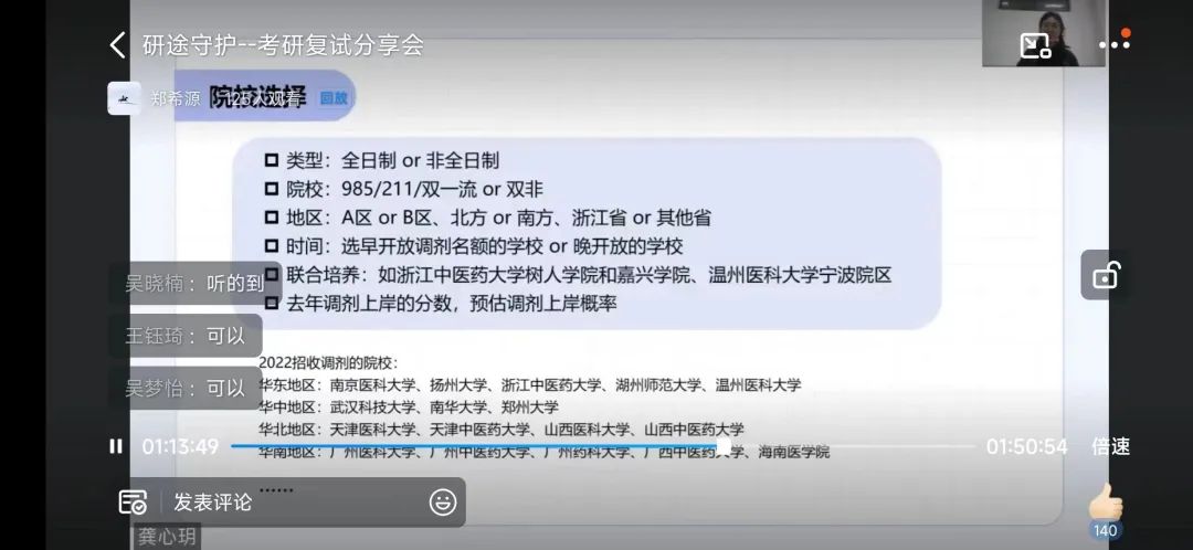 龚心玥学姐重点向同学们介绍了调剂流程、调剂要点和调剂院校的选择,并详细讲解了A区和B区、全日制和非全日制、双一流和非双院校的区别和调剂要求。此外,学姐结合自身调剂经历,分享了面试的相关注意事项和答题技巧,并针对调剂常见问题进行解答。
