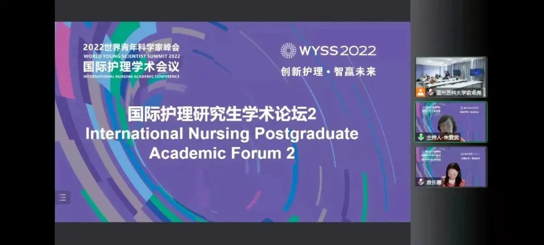 11月18日下午,2022世界青年科学家峰会国际护理研究生学术论坛在7C102、6A105会场同步举行。美国护理科学院院士、华盛顿大学教授Margaret Heitkemper,法国宜世学院精神运动康复治疗师Amélie TRUPTIL及31名来自国内外多所知名院校的护理博士、硕士研究生做大会发言。美国护理科学院院士、西安交通大学李小妹教授,美国护理科学院院士、复旦大学袁长蓉教授,大连医科大学taptap点点体育副院长史铁英教授,浙江大学妇产科医院护理部主任冯素文教授,华中科技大学同济医学院附属同济医院护理部副主任曾铁英教授,中国护理管理杂志社执行主编邓寒羽等担任点评嘉宾。taptap点点体育副院长、温州市护理学会理事长张春梅,温州市中心医院护理部主任、温州市护理学会秘书长朱爱武主持。